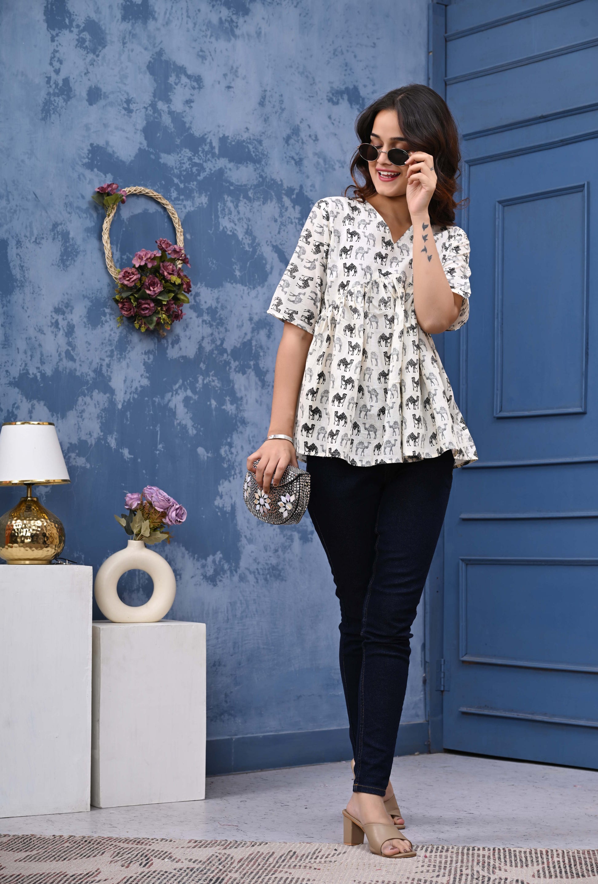 Elevate your wardrobe with our stunning Camel Print Sanganeri Women's Top. This exquisite piece showcases authentic Sanganeri craftsmanship with its distinctive camel motifs, blending traditional artistry with contemporary style. Perfect for both casual outings and semi-formal occasions, this versatile top promises comfort without compromising on elegance. Don't miss the chance to own this unique fashion statement that celebrates India's rich textile heritage.