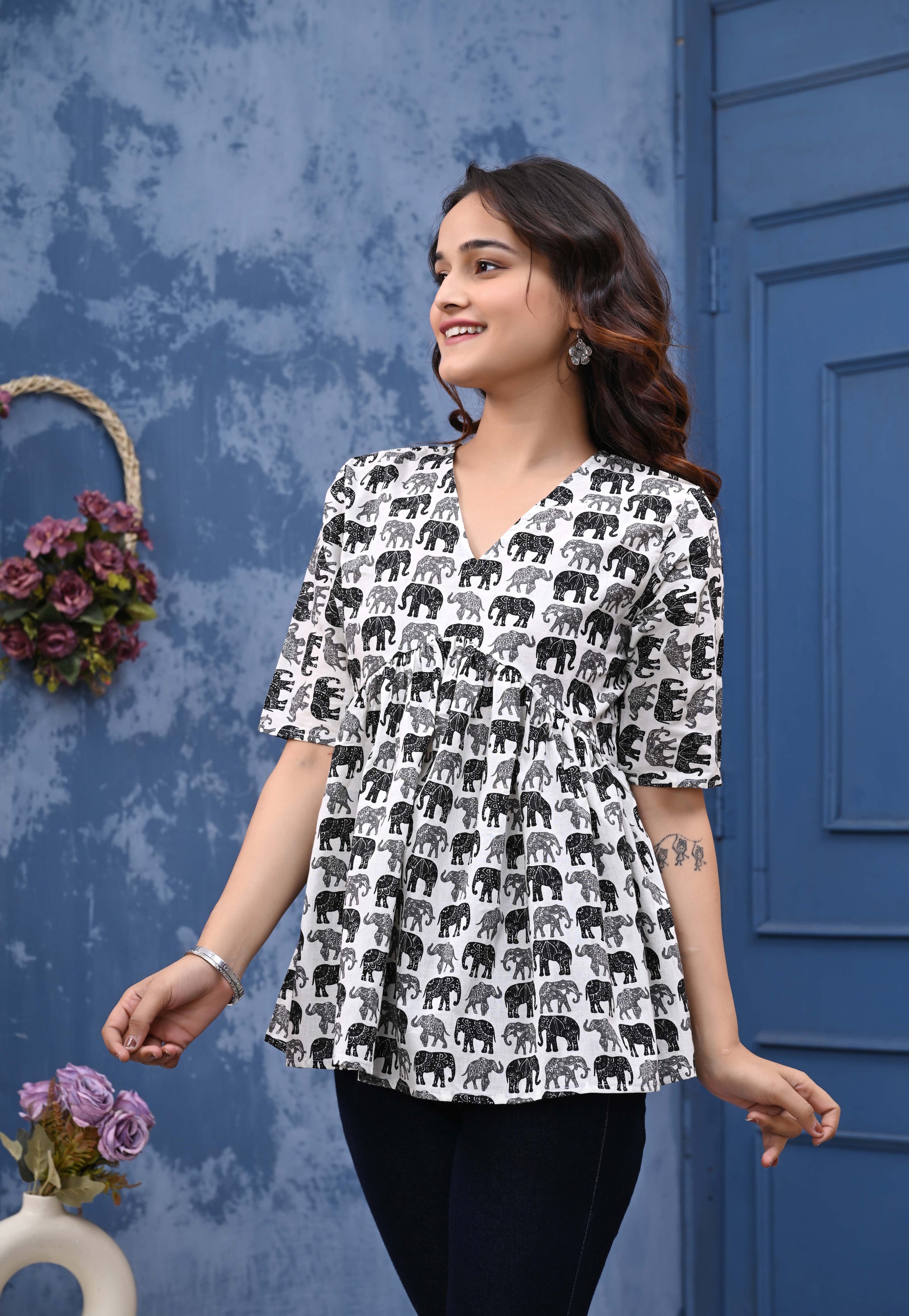 Embrace timeless elegance with our Elephant Print Sanganeri Women's Top, where traditional artistry meets contemporary style. This distinctive piece showcases authentic Sanganeri craftsmanship with intricate elephant motifs that celebrate India's rich heritage. Perfect for office environments yet uniquely ethnic in character, this top commands attention while offering versatile styling options. Elevate your wardrobe with this conversation-starting masterpiece that sets you apart from the crowd.