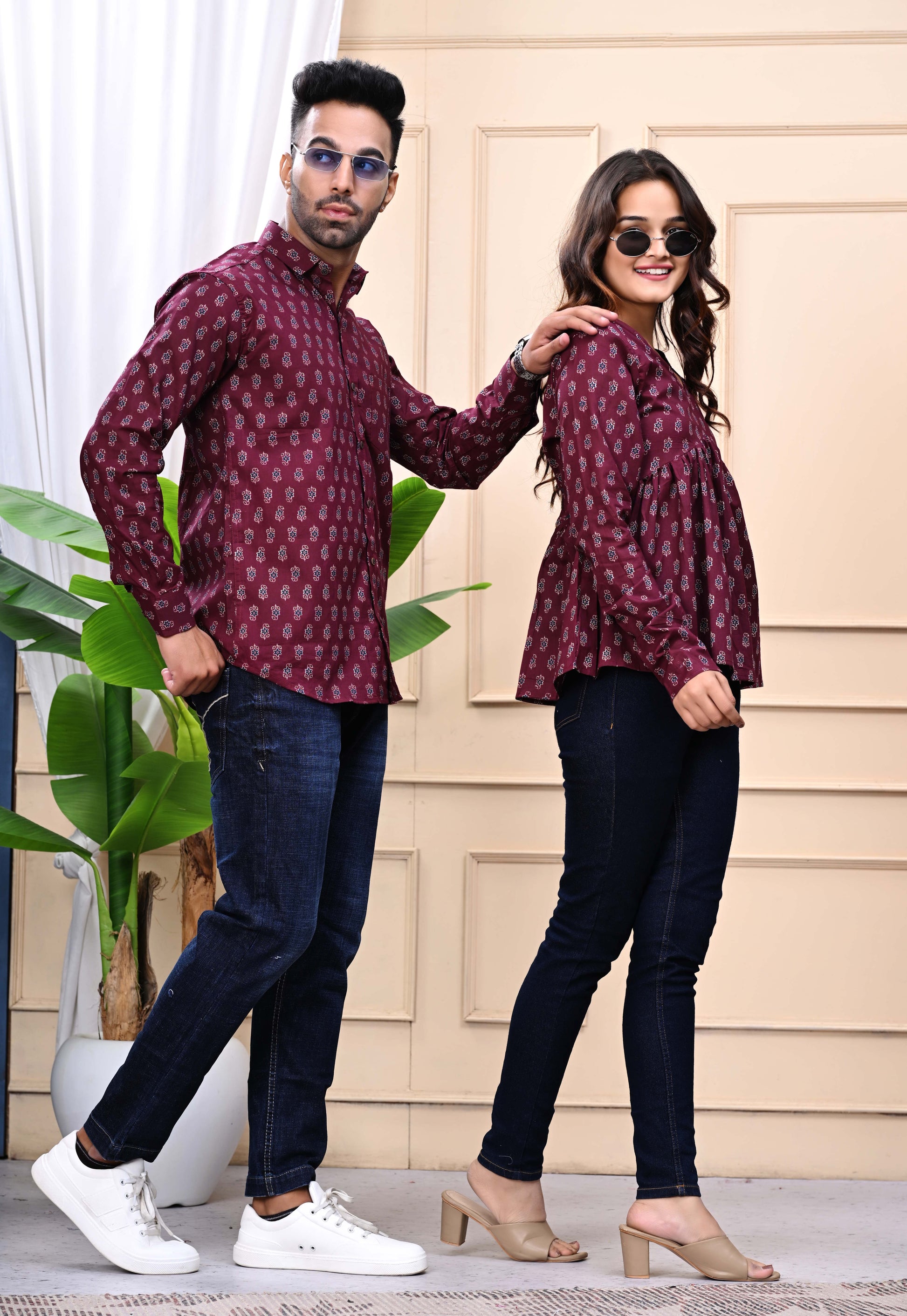 Elevate your style with our Maroon Sanganeri Printed Combo, featuring exquisite traditional prints on contemporary silhouettes. This versatile set includes a sophisticated women's top and a sharp men's shirt, perfect for transitioning from office meetings to evening gatherings. The rich maroon hue and authentic Sanganeri craftsmanship ensure you'll stand out with timeless elegance wherever you go.